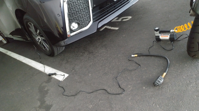 では、いつものようにヴェルファイアのご協力により電気を供給して電動空気ポンプをオン!