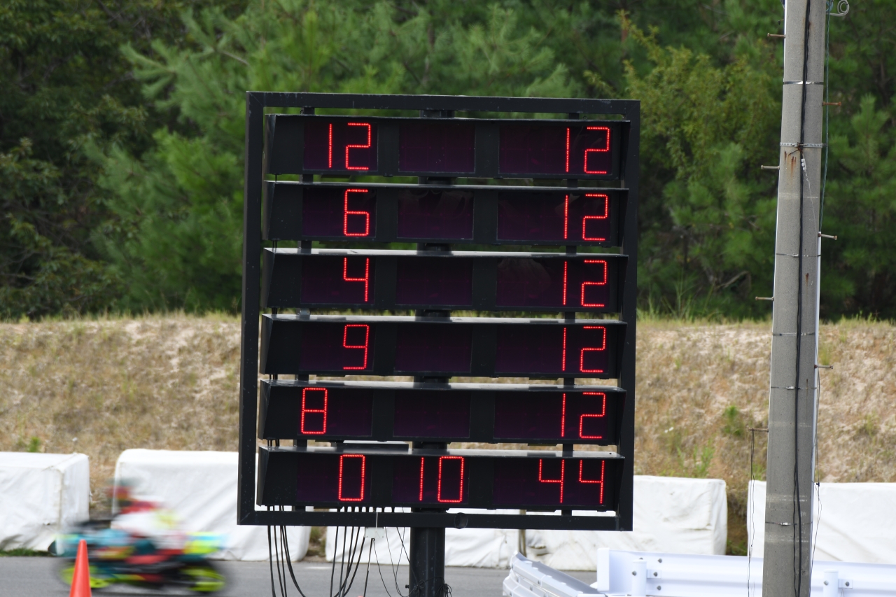 1コーナー脇にタイム・順位表示用電光掲示板が設置されています
