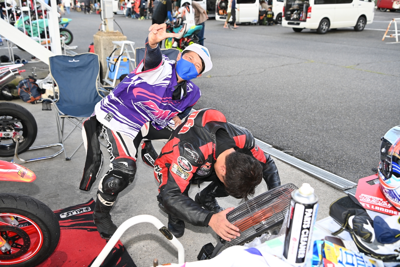 ピットクルーが不在なので、ライダー自らがピットサイン出し