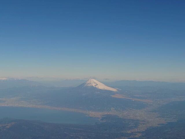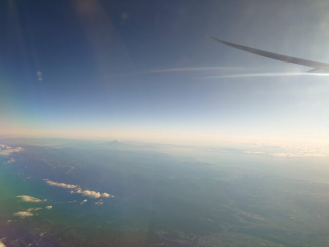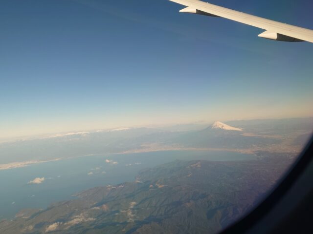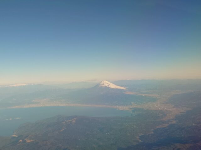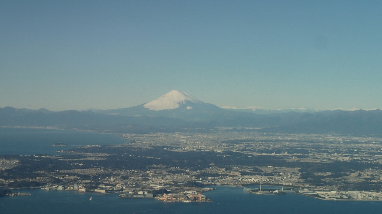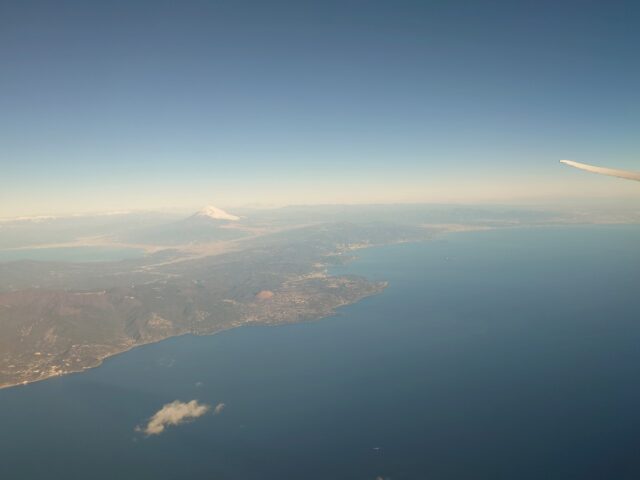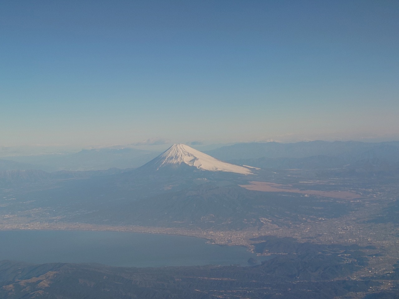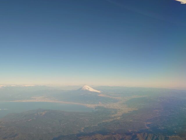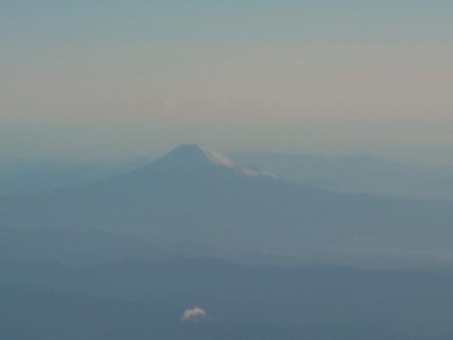 左旋回して東へ向かうと、もやってるけど裾野からの富士山