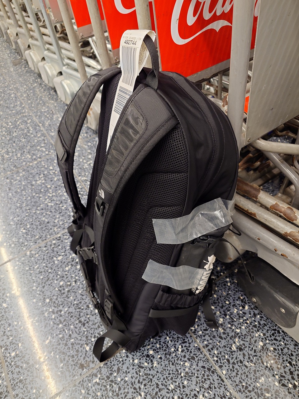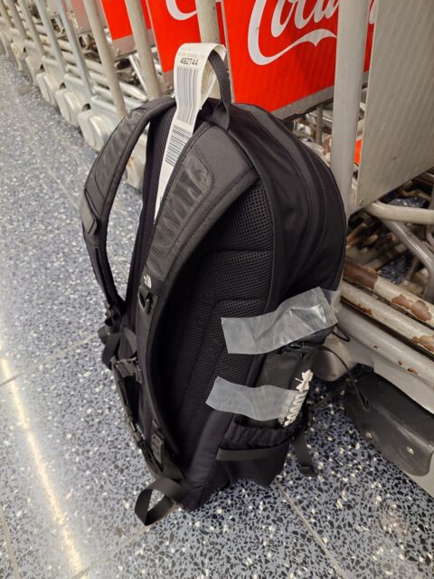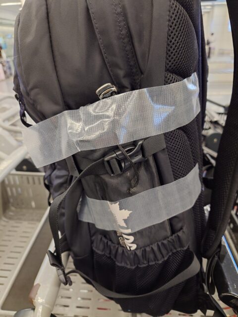 「横ポケットにお入れのコンパクトチェアが飛び出さないように、テープを貼らさせていただきます」