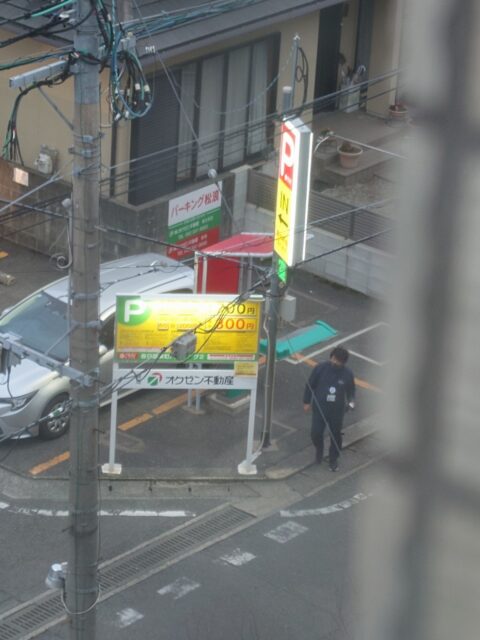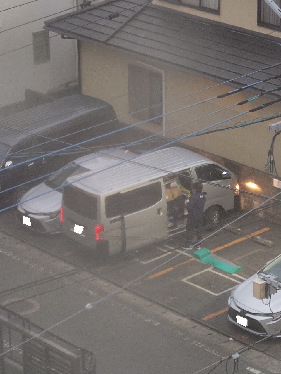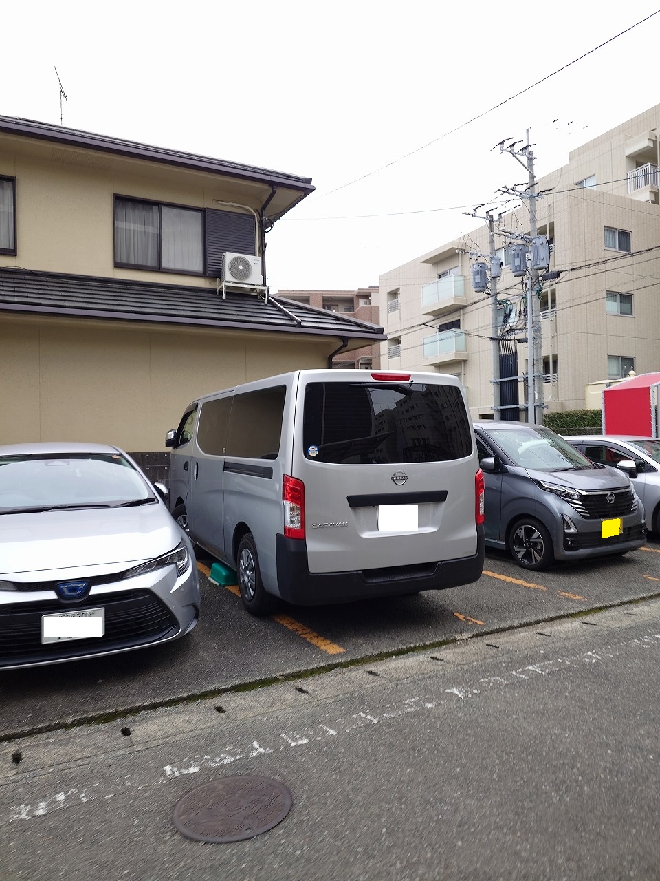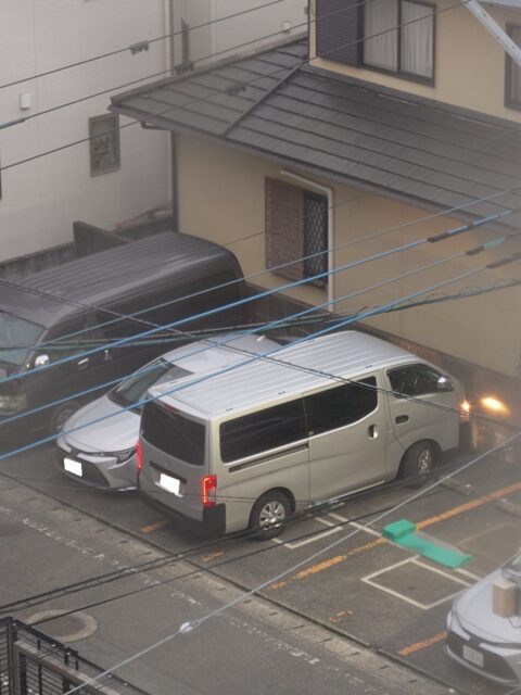 マンション前の駐車場にはリフォーム関連業者のハイエース