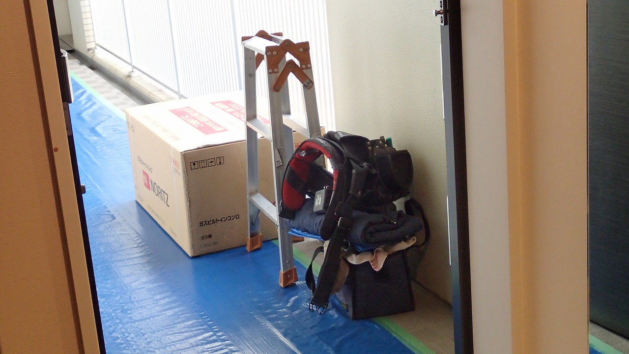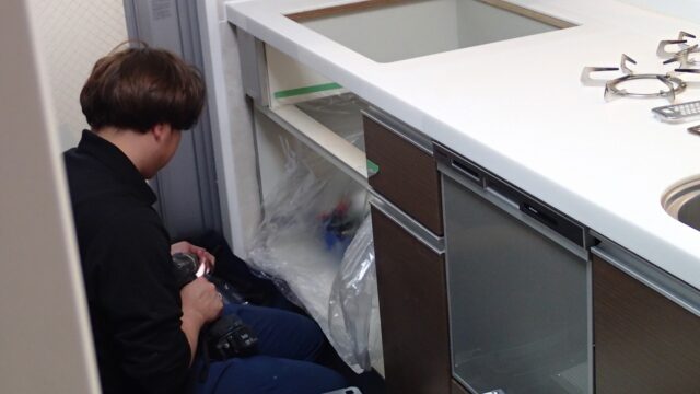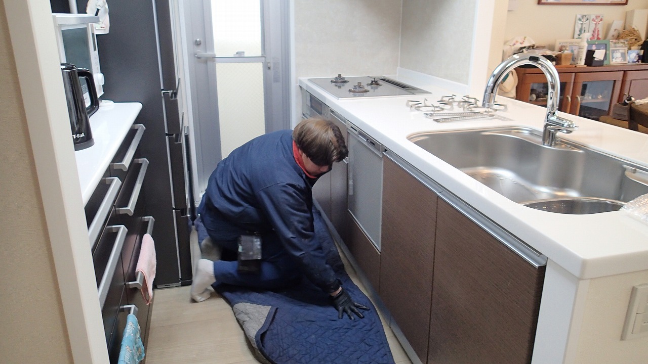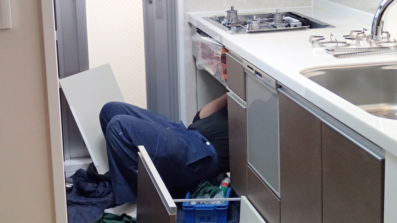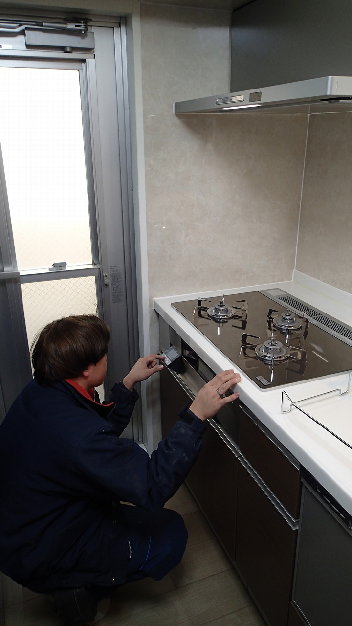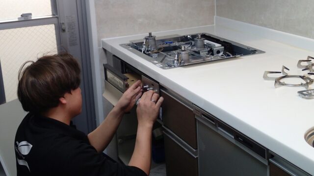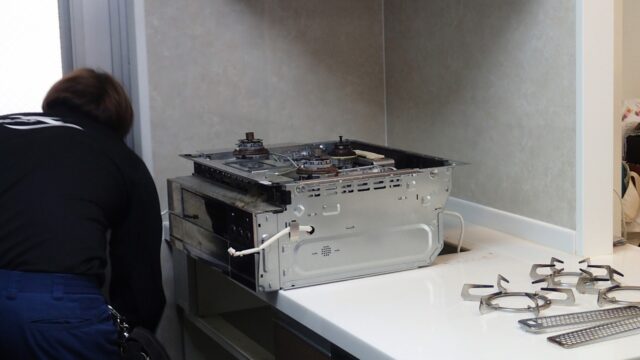 10:27 給湯器の作業がほぼ終わり、同じ職人さんがガスコンロの交換に着手