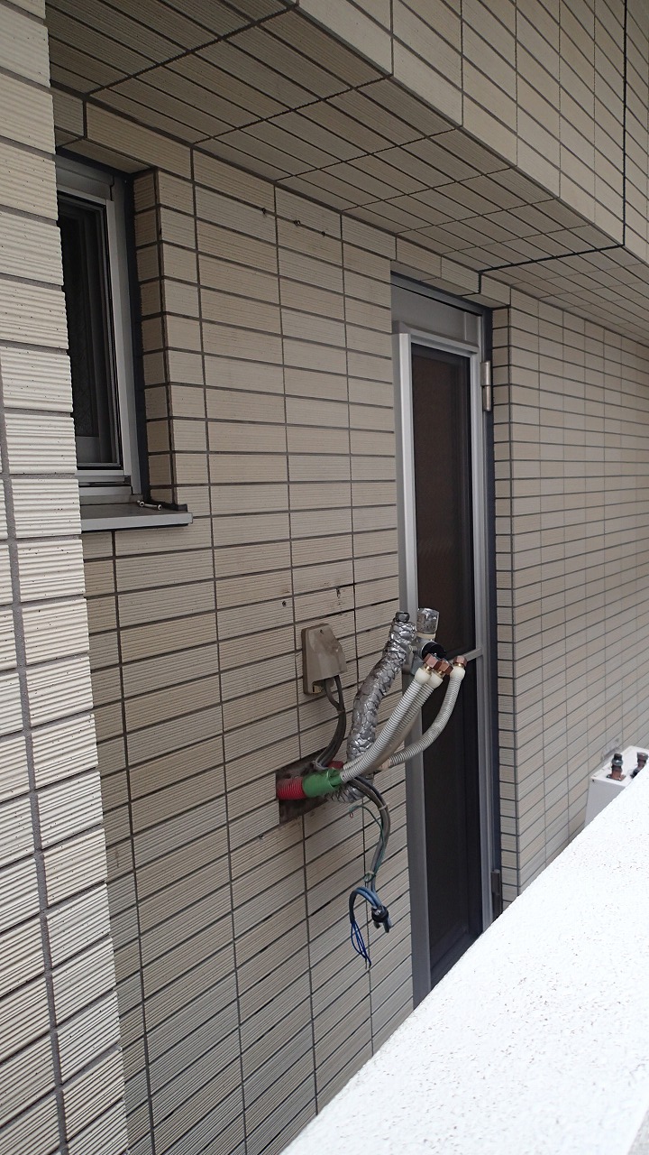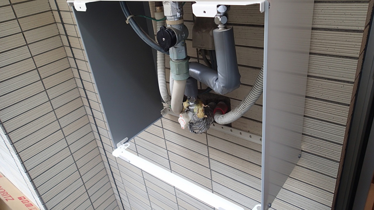ベランダでは給湯器への排管等のカバー施工中