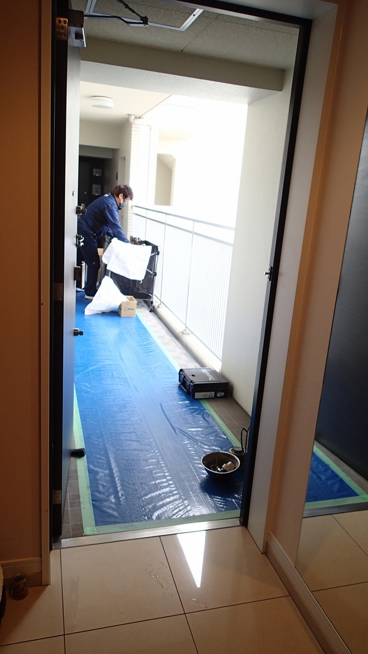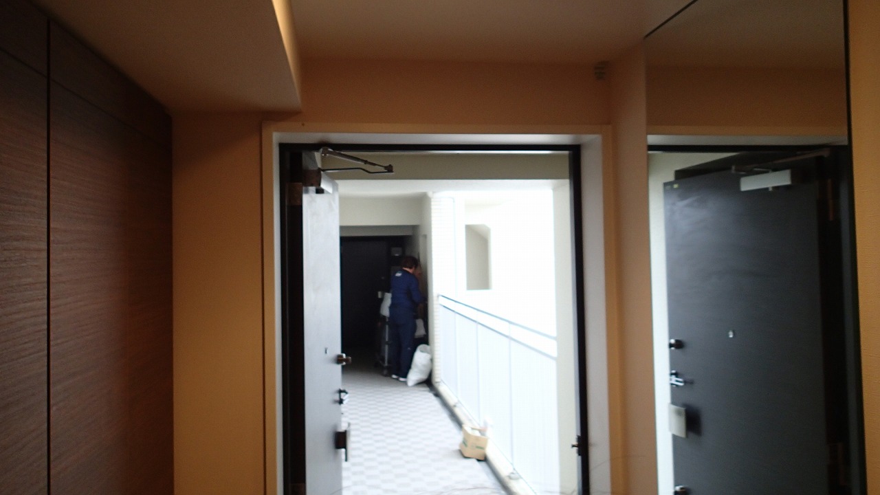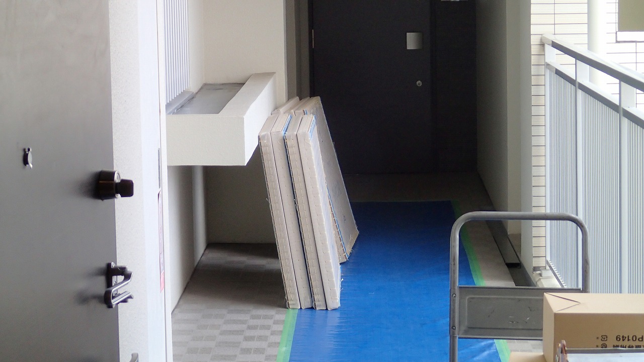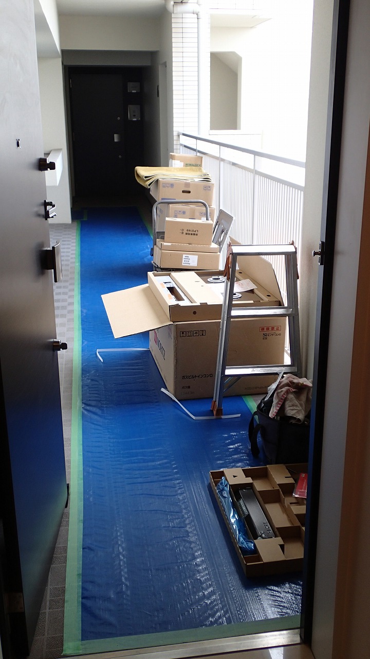 玄関ドアの前には資材山積み