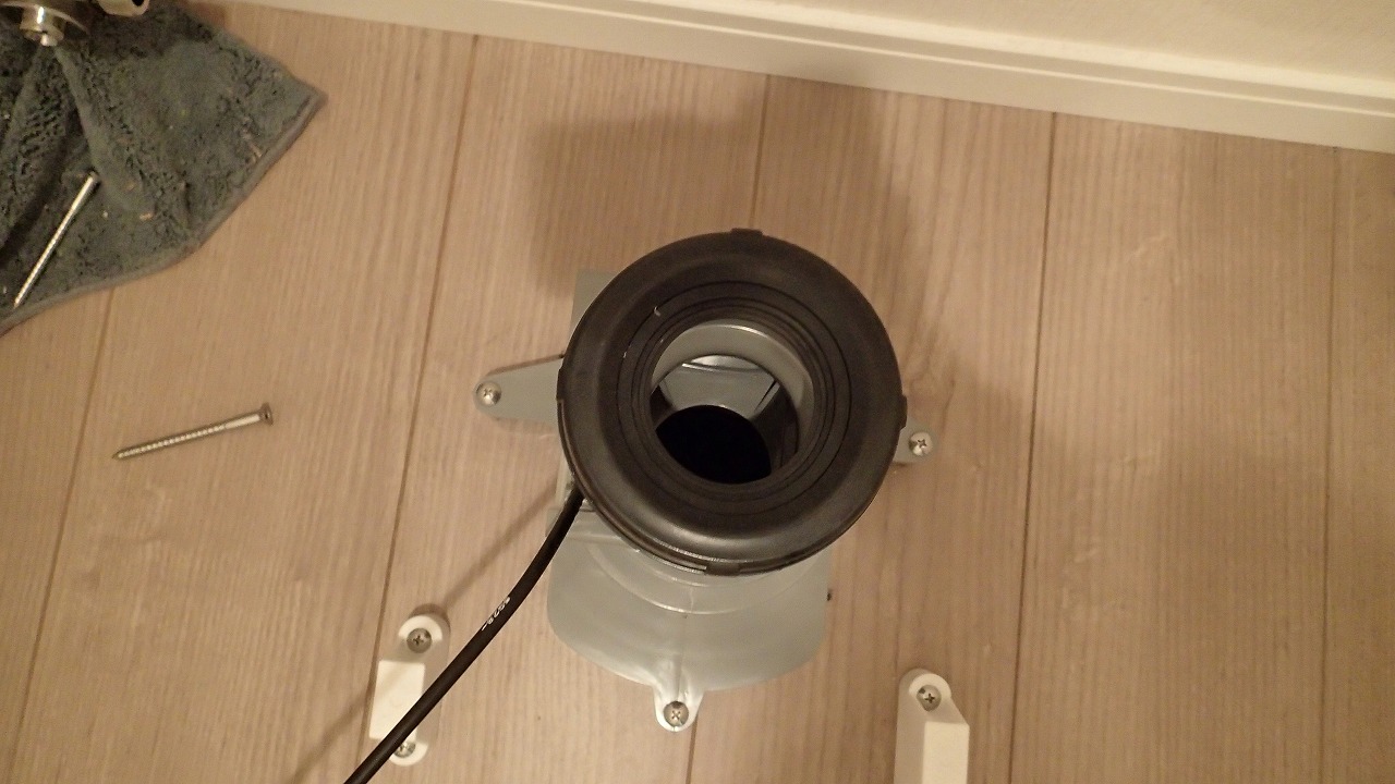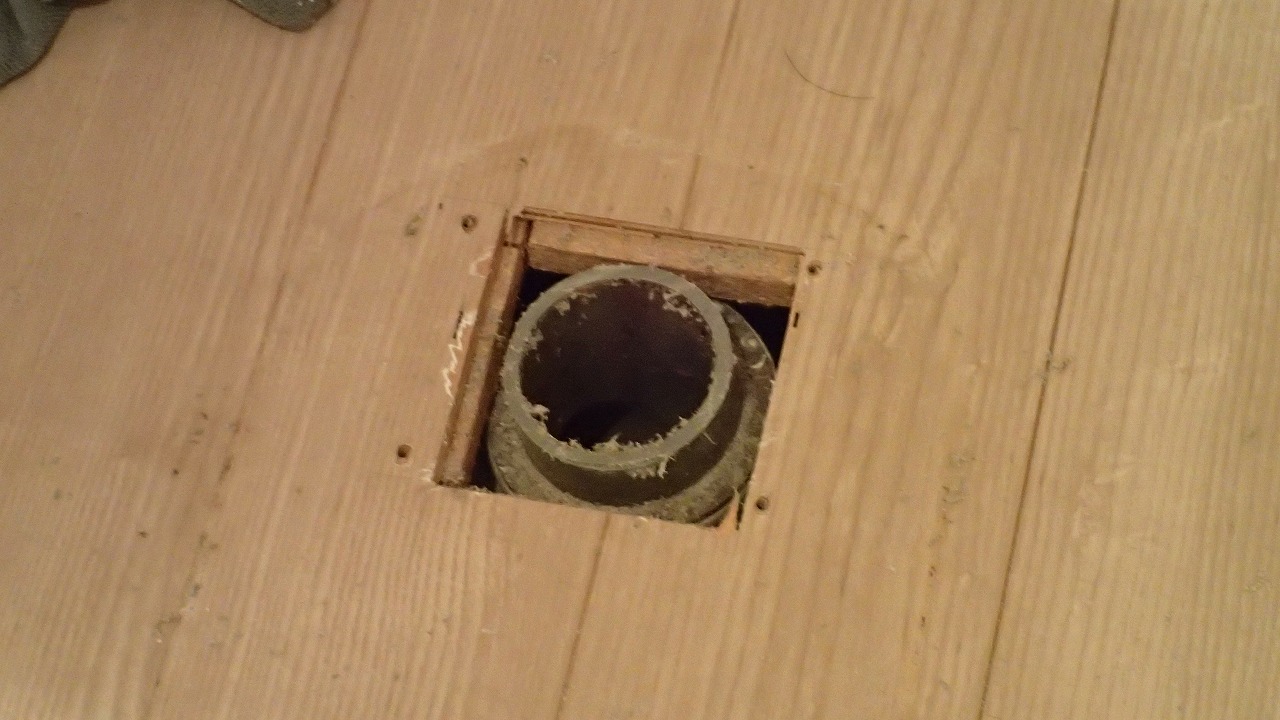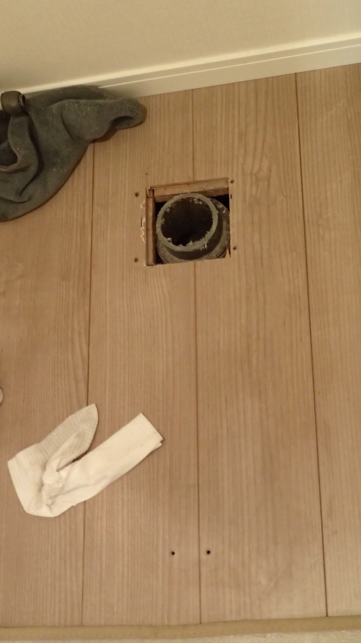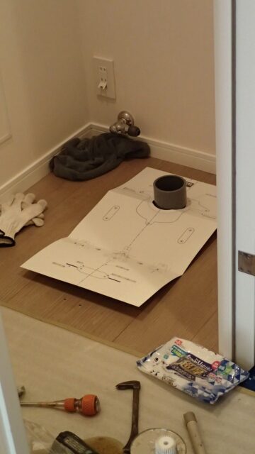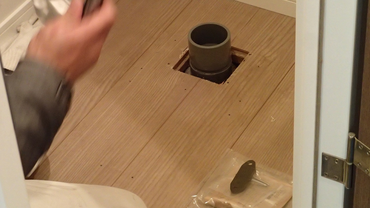 手前の、以前の便器取り付けの穴がはみ出てる・・・