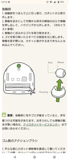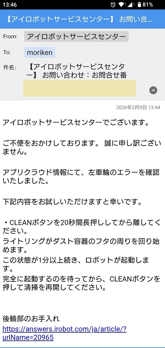 「本体を再起動してください」&「左車輪部分を清掃してください」