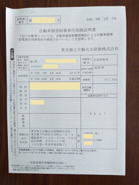 こちらは「自賠責損害賠償責任保険証明書」