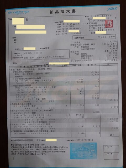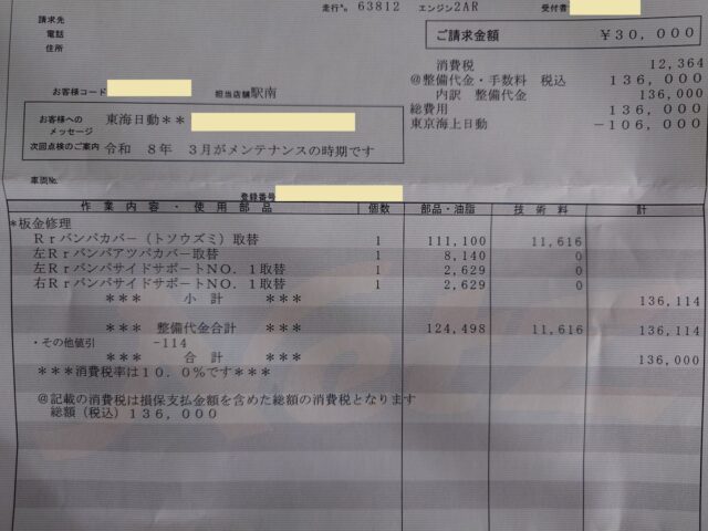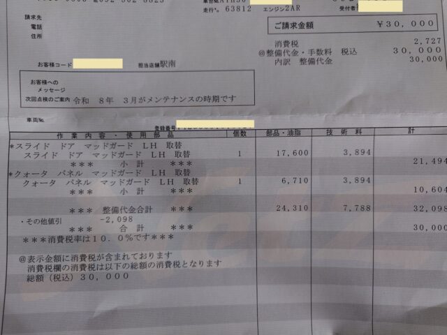 最後の1枚は、2024年9月の点検では見送ったマッドガードの修理代金