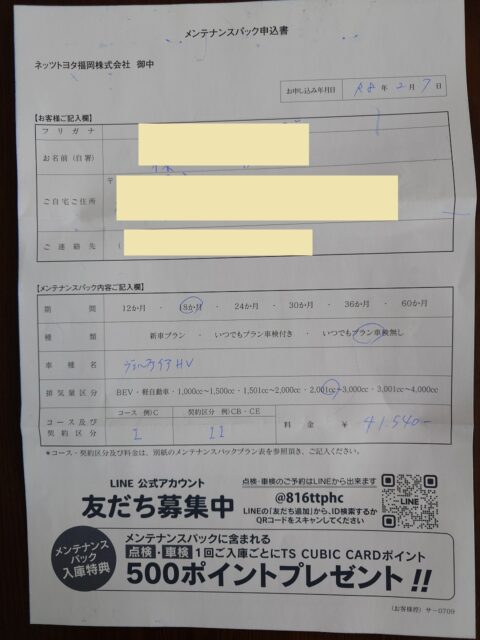 最後に車検ごとに更新する「メンテナンスパック」申し込みの控