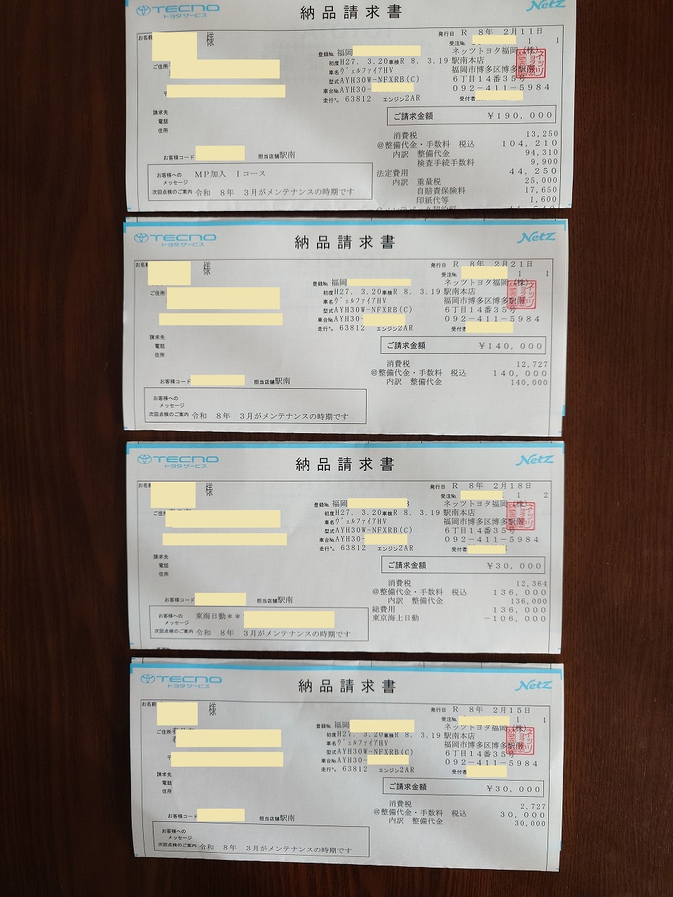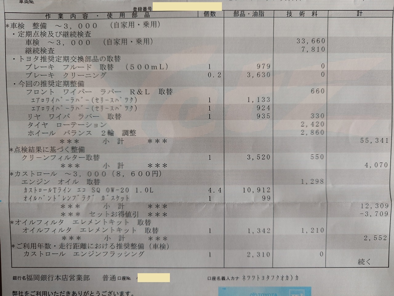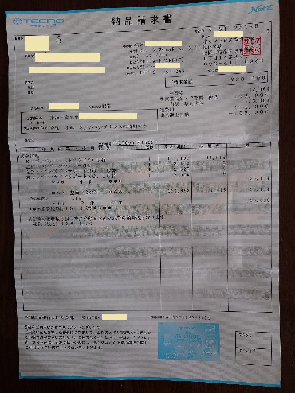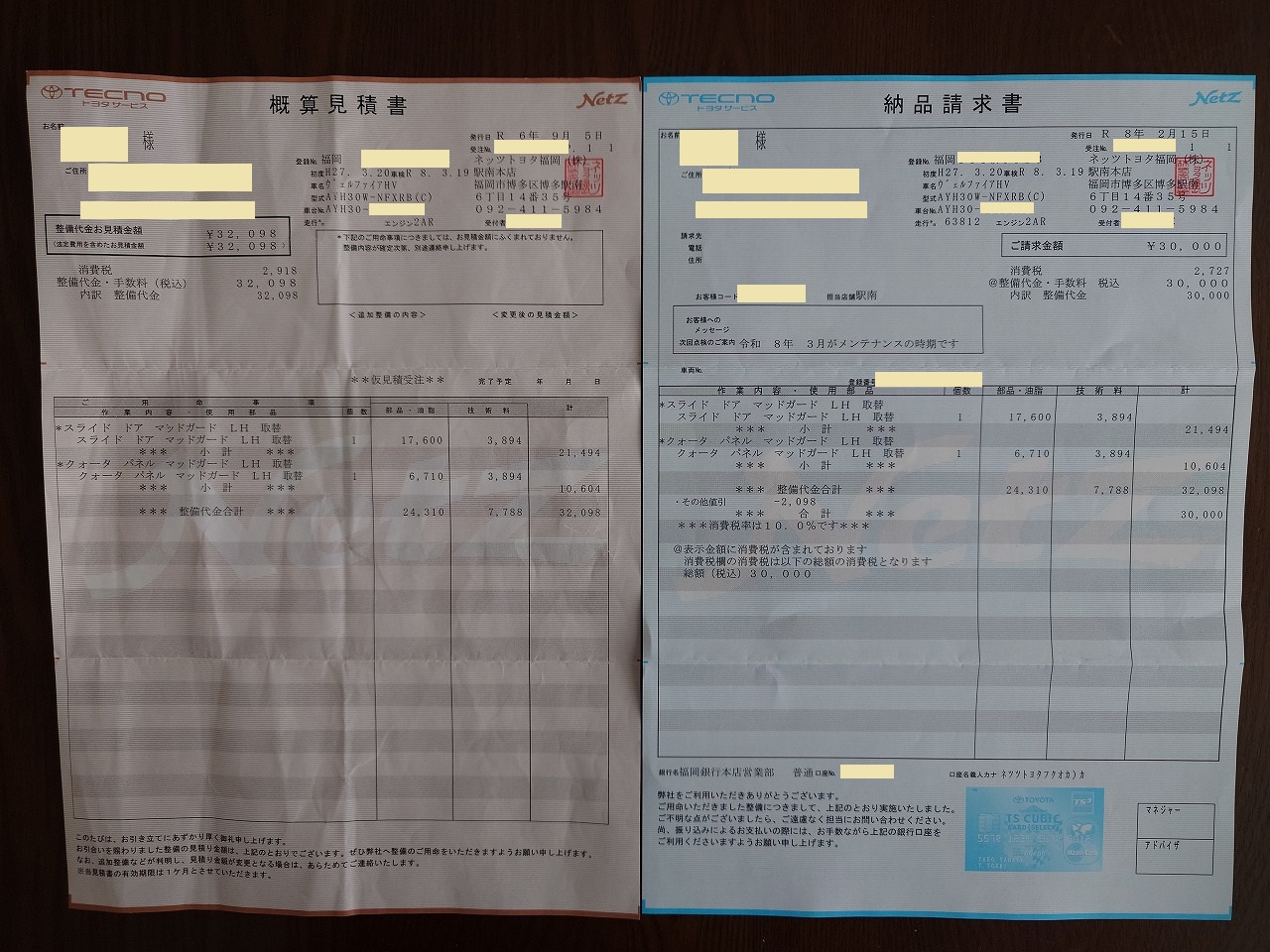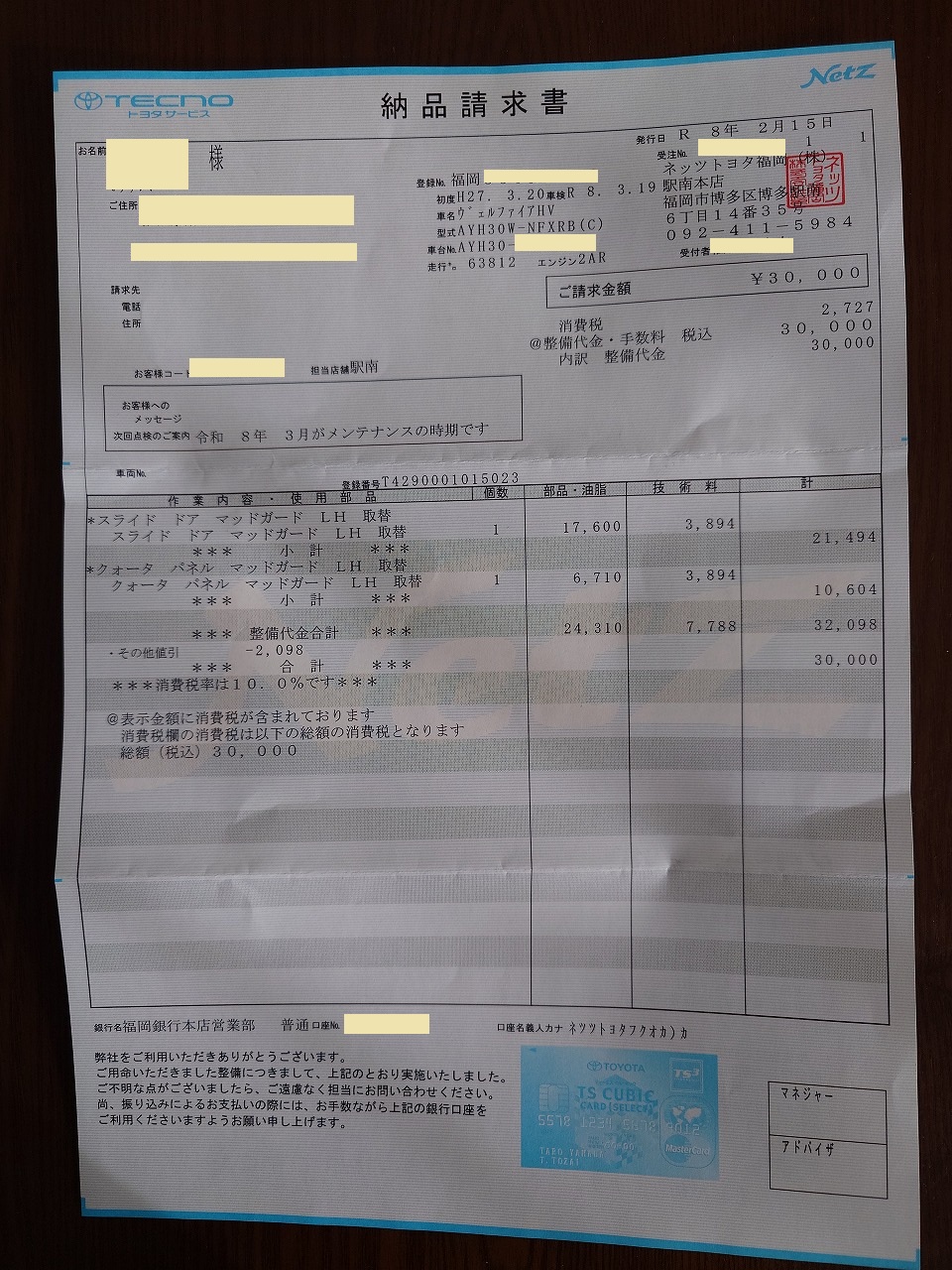 最後の1枚は、2024年9月の点検では見送ったマッドガードの修理代金