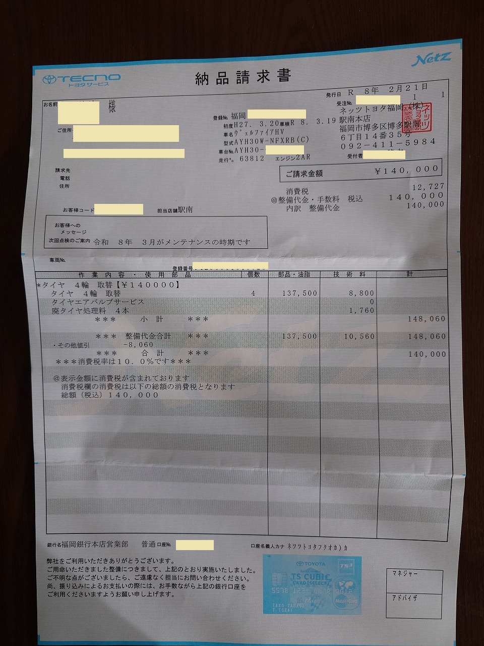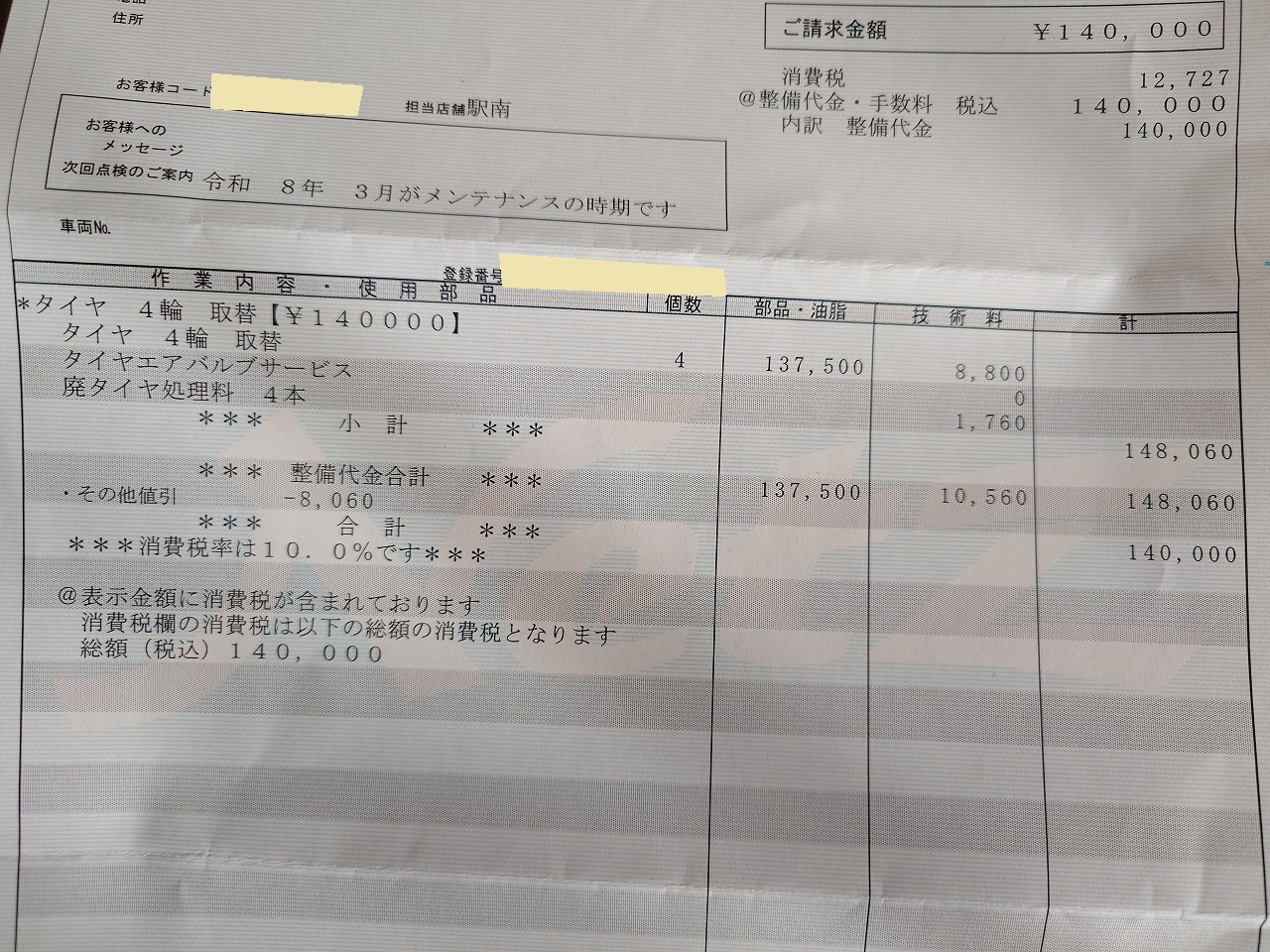 次に、後で追加注文したタイヤ交換費用