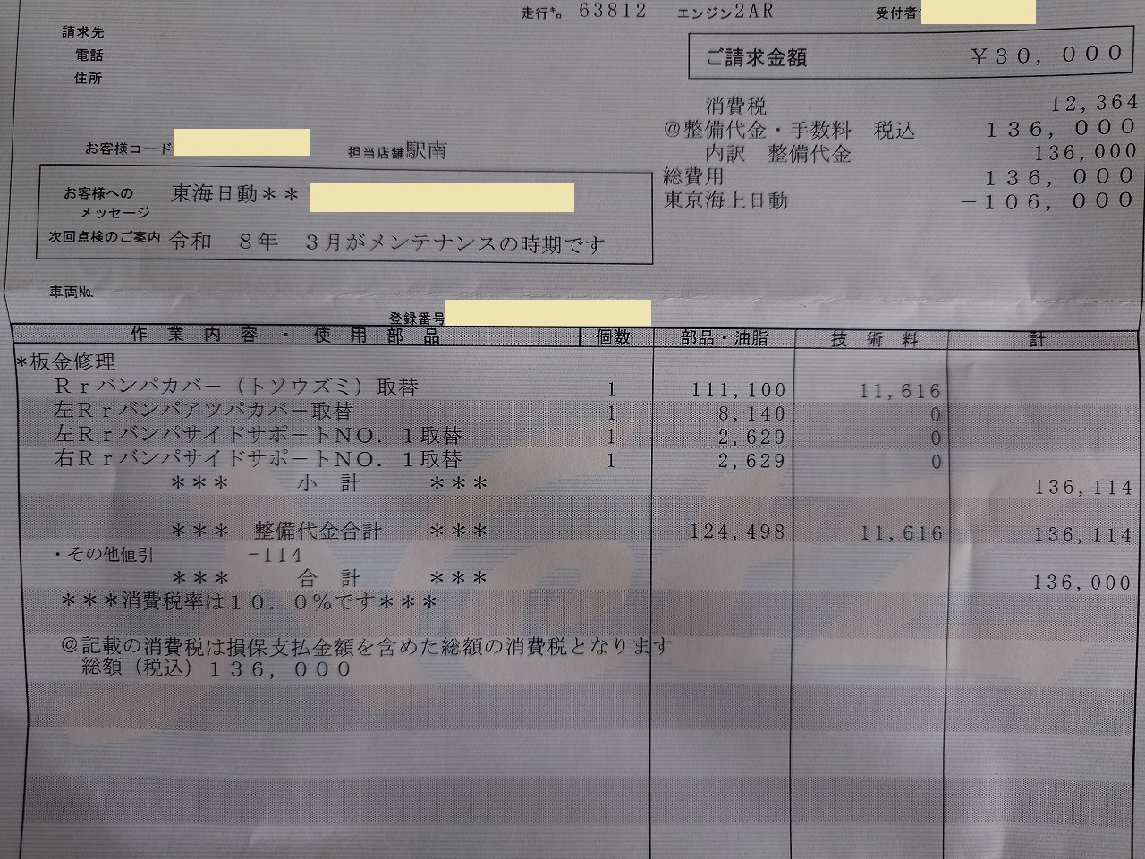 総額は13万6千円だが、自分の負担は免責金額な3万円のみ