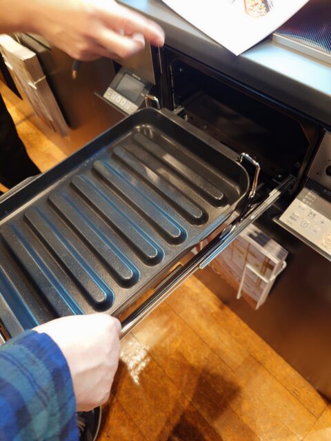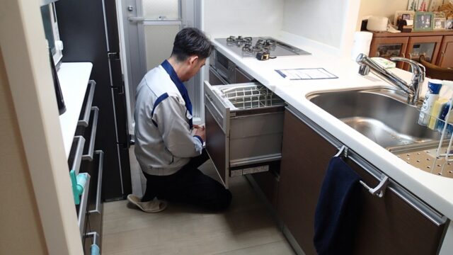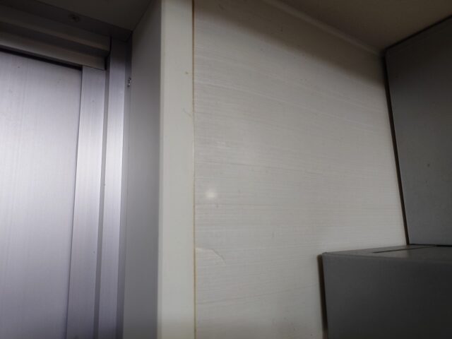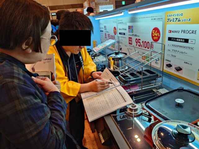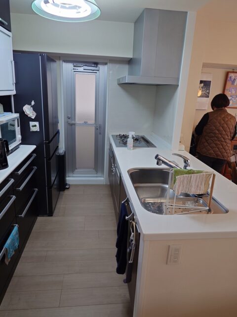 キッチンのコンロ周りの壁紙(パネル)の状態を確認し、壁紙専門職人は一人先に退出