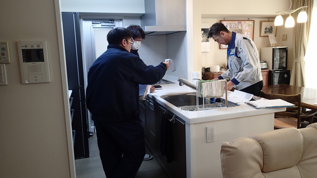 キッチンのコンロ周りの壁紙(パネル)の状態を確認し、壁紙専門職人は一人先に退出